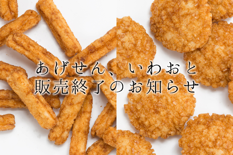 長年ご愛顧いただいて参りました「あげせん」、「いわおと」ですが、昨今の米価格の高騰や工場の生産体制の見直しなどにより、今まで通りの安定した製造及び供給が難しくなってきたことから、2025年10月31日をもって 、販売を終了させていただくこととなりました。