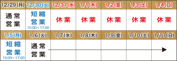 店舗の年内営業は年内は12月30日(火)までとさせていただきます。(※12月30日は10時00分〜17時00分までの短縮営業)