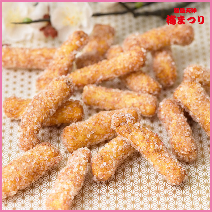 そんな梅まつり期間しかお買い求めいただけない限定のお菓子「うめざらめ単衣」を今年も販売いたします。国産のもち米を使用し、甘辛に煮た愛知県産のたまり醤油を絡め、紀州産の梅を使用した大粒の梅ざらめをまとわせたあられです。ざらめと甘辛醤油の甘じょっぱさ、時々やってくる梅のほのかな酸っぱさがアクセントになり、次々と手が出てしまう、癖になる味わいです。さらに、もち米を一度焼いた後にサッと揚げる焼き揚げ製法により、しっかりとした食感に仕上げています。