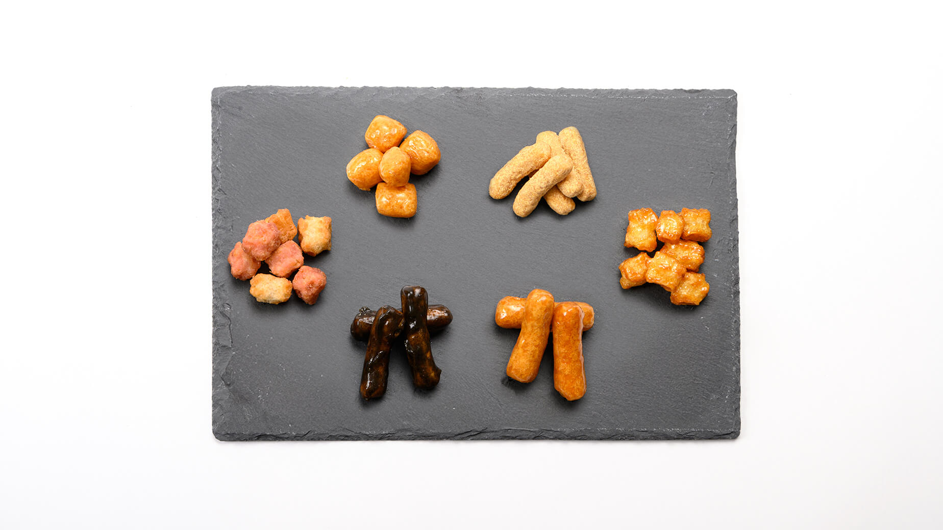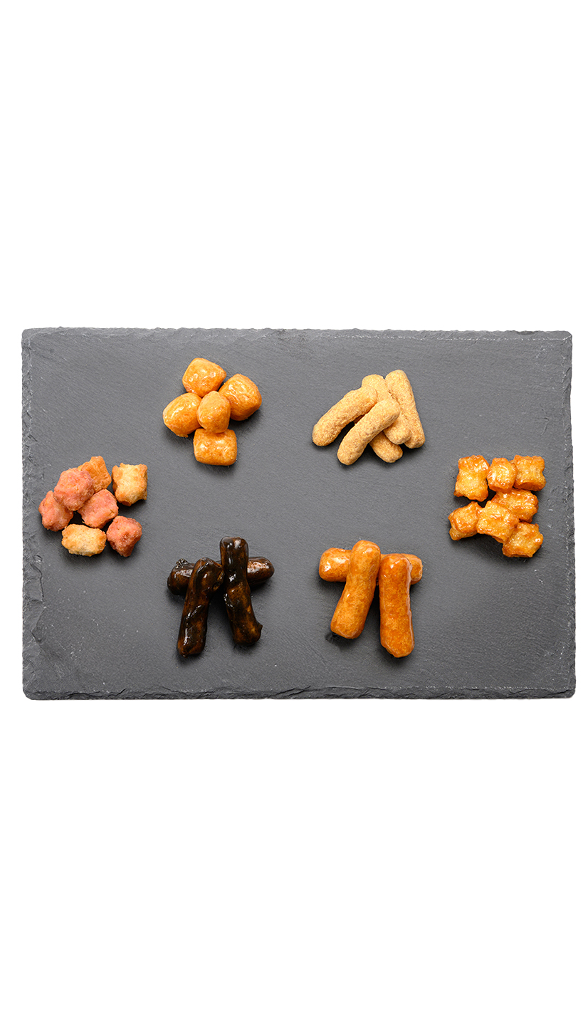 かりんとうと同じ上白糖を煮詰めたべっこう飴を、国産こめ粉100%使用の一口サイズのあられに絡めました。かりんとうに比べて食感が柔らかく、女性の方や、ご年配のお客様からご好評をいただいております。上品な甘さがあとを引き、もうひとつ、もうひとつとついつい手が伸びてしまうお菓子です。余談ですが、この商品が昭和天皇の在位50周年の年に生まれたので、君が代の一節から”さざれ”と命名しました。